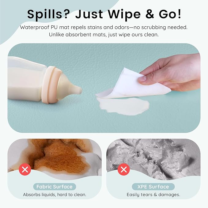 - Premium Eco-Friendly PU Leather - Just Wipe & Go! The baby play mat features a non-toxic, waterproof PU leather surface that resists stains and odors. Simply wipe clean with a damp cloth—no washing needed! Plus, the removable cover makes deep cleaning effortless.