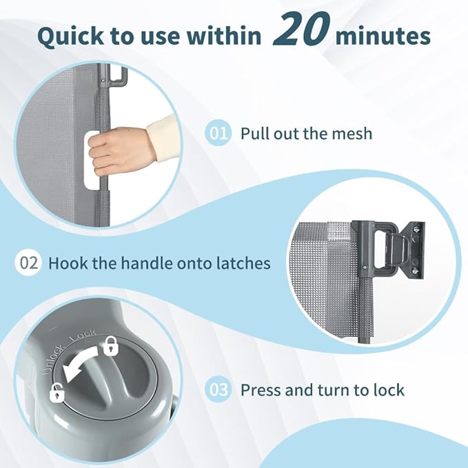 - PROVIDE SAFETY & SECURITY: The retractable pet gate provides a safe environment for babies and pets and serves as an effective space divider. Our mesh baby gate feature with clear visibility, it allows you to easily monitor your child's explorations.