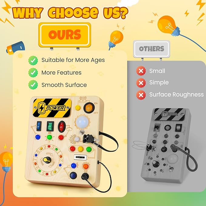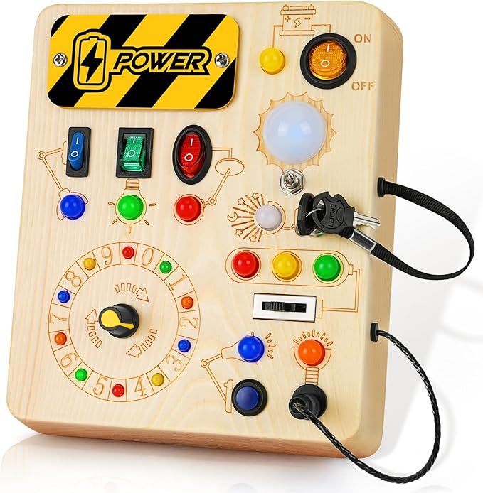- [Interactive Toddler Learning Board] This wooden busy board features multiple engaging switches and vibrant LED lights (requires 2 AAA batteries, not included) to spark curiosity. Designed without screens or noise, it encourages toddlers to explore everyday electronics safely while developing fine motor skills.