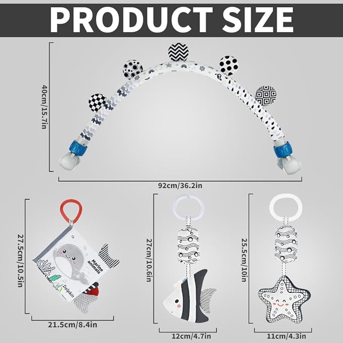 Baby Activity Travel Mobile Arch Bassinet Toy, Black and White High-Contrast Crib Toys, with Rattle and Book, Strolle,Pram and Crib Attachment with Hanging Toys (Ocean)