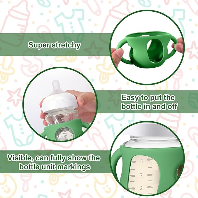 - Drop protection : Silicone bottle sleeves provides excellent protection for the bottle, bottom with reinforcement design, give that extra cushion in case the glass bottles fall, protect baby’s bottles from accidental drops breakage. It also anti-scalding if the glass is a little warm from heating up formula or milk