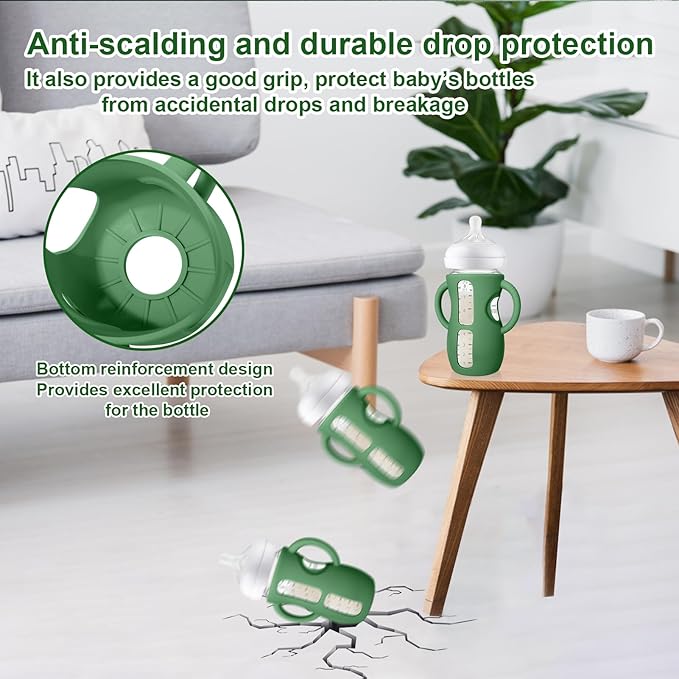 - Drop protection : Silicone bottle sleeves provides excellent protection for the bottle, bottom with reinforcement design, give that extra cushion in case the glass bottles fall, protect baby’s bottles from accidental drops breakage. It also anti-scalding if the glass is a little warm from heating up formula or milk
