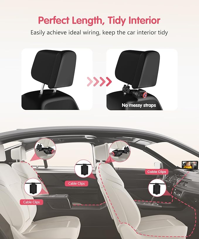 - ๐๐ ๐๐ฟ๐ฎ-๐๐ผ๐ป๐ด ๐๐ฎ๐ฏ๐น๐ฒ: Extra-long 22ft (6.7m) cable fits 99% of carsโno need for extra cords. This double baby car camera for rear facing infants works perfectly in SUVs, sedans, and more. Cable clips included for a clean, tidy setup.