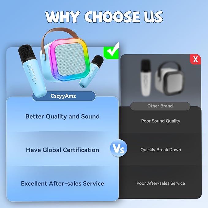 - 【Take the Party Anywhere】10H Playback(USB-C rechargeable) beats 90% of mini karaoke machines.Small and light design is convenient for you to take anywhere.And you can safely let your children play mini karaoke machine by themselves(meets toy safety standards).We promise provide replacement for any product damage within 5 years.