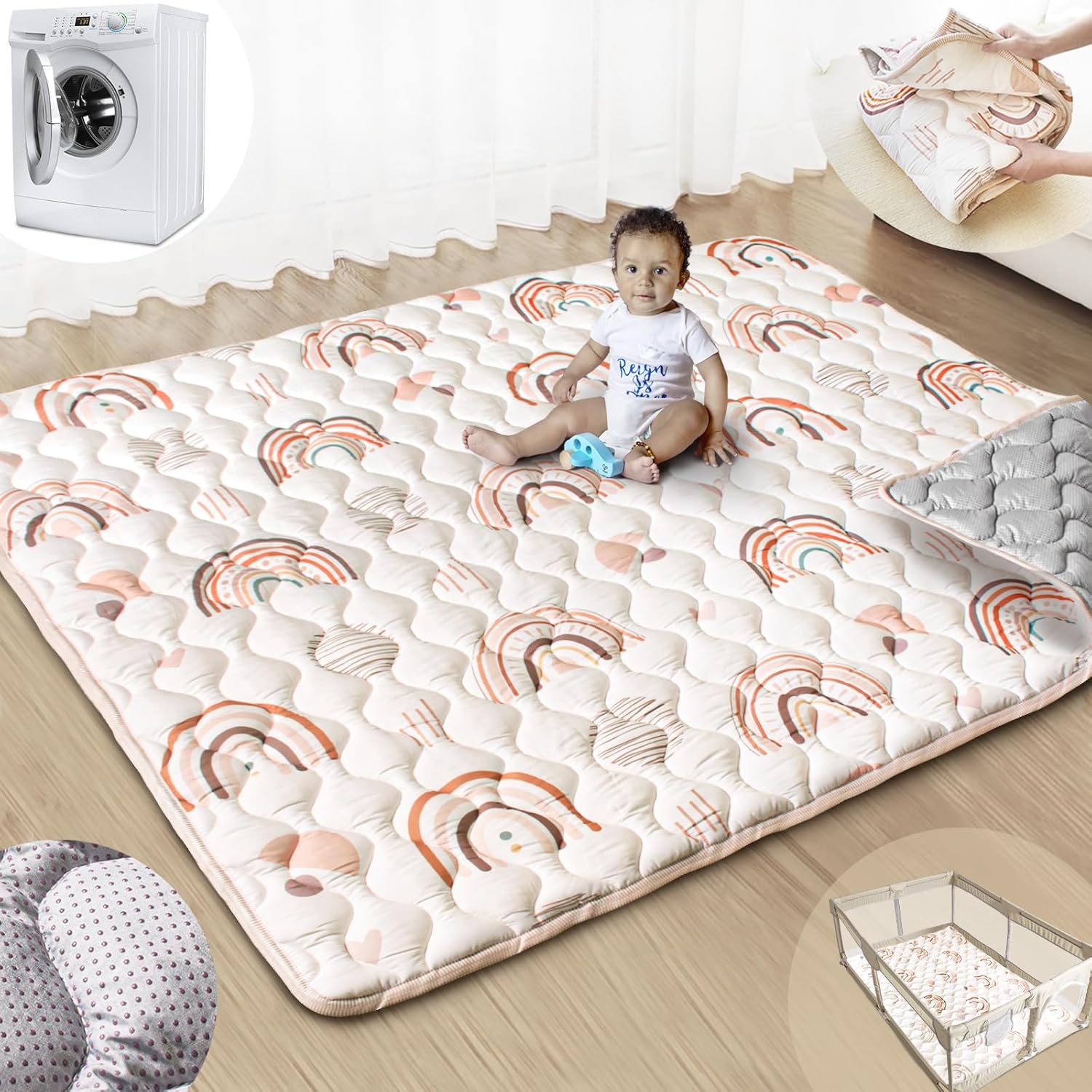 Baby Play Mats for Floor, 71”x59” Upgraded Thickness & Larger Super Soft Playmat for Babies and Toddlers, Foldable Washable, Upgrade Anti-Slip Crawling Mat for Playpen(Boho Rainbow)
