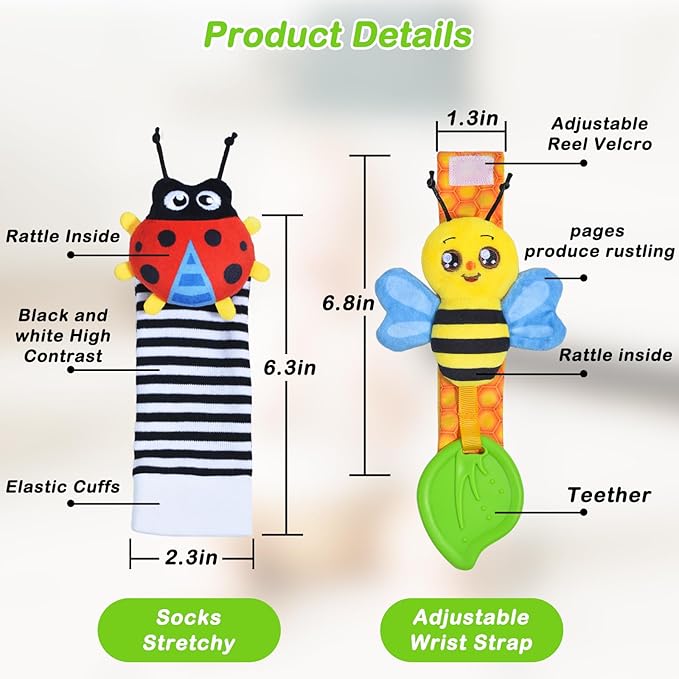 - Rattle Socks Wristband Set-This baby sensory toy set includes two soft wrist rattles,two cute foot finders and two soothing teething toys,the adorable garden bug designs are crafted to attract your baby's attention,encouraging them to touch,grab,and explore,extremely companions for your baby's growth.