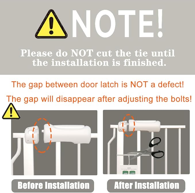 - EASY INSTALLATION: Pressure mounted gate is quick to set up and uninstall in 5 minutes without additional hardware or tools. 4 spindle rods let you adjust top and bottom independently. NOTE: a gap between the gate latch and the frame is NOT a defect NOR bent. Please do not cut the elastic rope until the gate lines up with the latch successfully and becomes secure