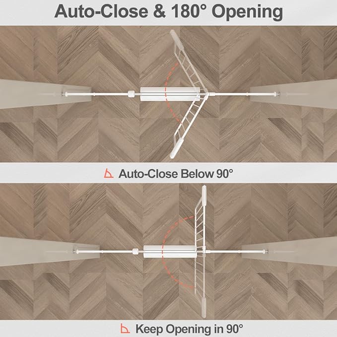 - AUTOMATIC & MULTI-FUNCTIONAL: The baby gate will close automatically when handle is released. No need to worry about forgetting to lock the gate. Double sided design allows you open it from both directions for convenience. Suited for stairs, hallway, doorways, kitchen, living room and any open space