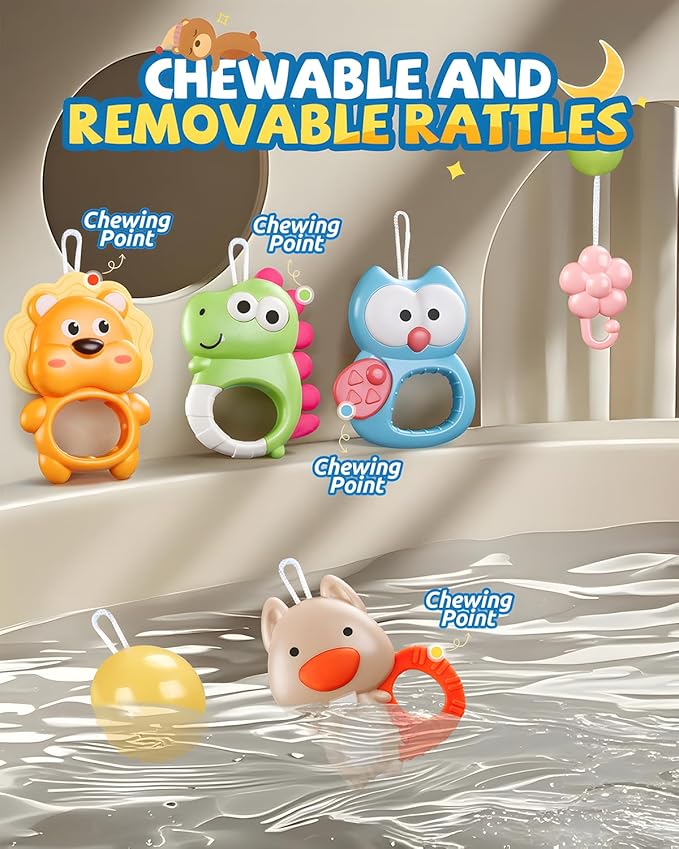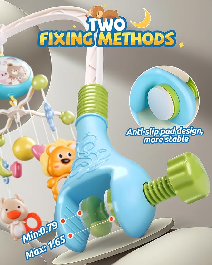 - 【Intelligent Rotation】One-touch switch between music rotation and silent rotation modes. Five cute rattles slowly rotate 360° and dance gracefully. The scientifically designed 45° angle attracts babies' attention and prevents visual fatigue, effectively promoting visual tracking ability and cognitive development. (Requires 3 AAA batteries)