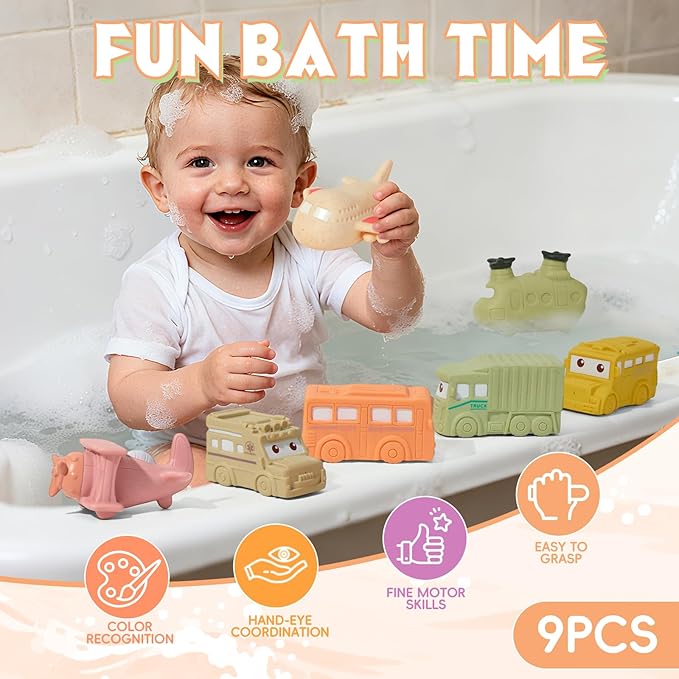 - 【9-Piece Colorful Cars Bath Toys】Includes 9 adorable floating cars bath toys: Police car, truck, School bus, City bus, Fire engine, Jet Airliner, Submarine, Airplane. Each kids bath toy features bright, eye-catching colors to keep babies engaged and make bath time more fun and interactive