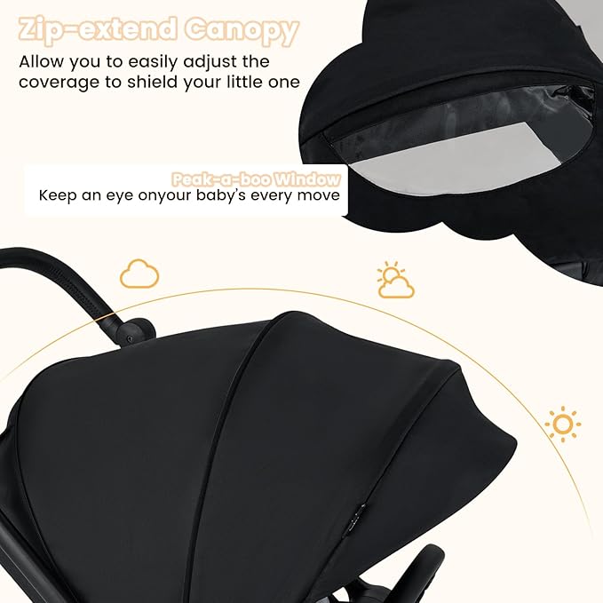 - 3-Level Adjustable Comfort: This reversible stroller offers unparalleled customization to meet your baby’s changing needs.. Extend the canopy with a zip for extra shade, modify the reclining backrest and adjust the footrest for your child’s ultimate comfort. The peek-a-boo window on the canopy allows you to keep an eye on your little explorer without stopping.