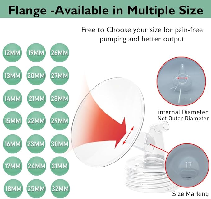 - 【Multiple Sizes, Precise Choice】: We offer 21 sizes of flanges,12/13/14/15/16/17/18/19/20/21//22/23/24/25/26/2728/29/30/31/32mm different flange sizes are available for more exactly choosing the size for your nipples.Different Periods Provide More Cozy Experience, selection of the right flange size can help the breast milk to drain smoothly.