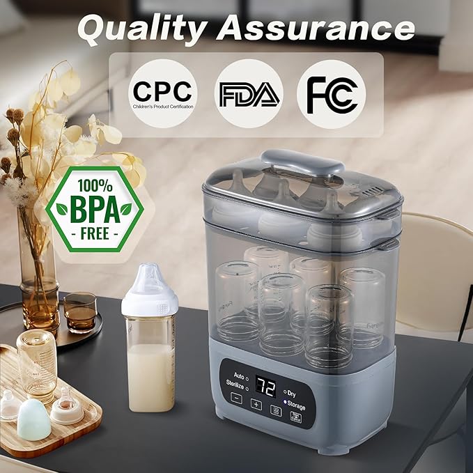 4-in-1 Baby Bottle Steamer and Dryer, Electric Steamer with Fast Drying, Universal Fit for All Bottles, LED Touch Screen & Auto Shut-Off Protection (Grey)