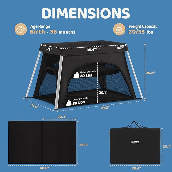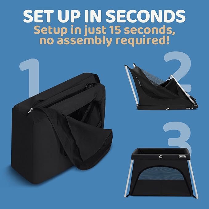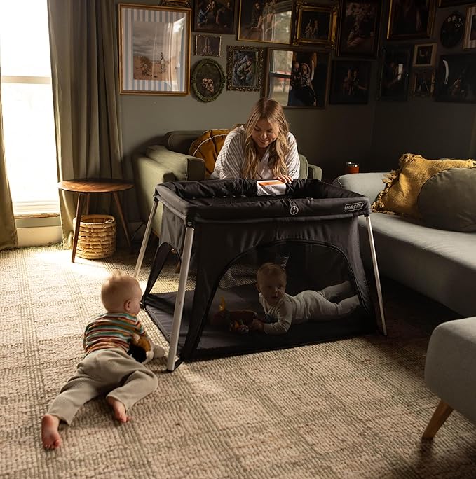 HARPPA Travel Crib with Comfy Mattress, Lightweight Portable Crib Requires No Assembly, Foldable Pack and Play for Baby and Toddlers, Compact Play Yard with Bed,Black