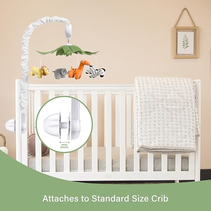 - 【Safari Adventure in Motion】Inspire tiny explorers with a rotating jungle-themed crib mobile featuring plush safari animals (mighty lion, adorable giraffe, playful zebra and sweet elephant) that bring wild wonder to baby girls’ or boys’ nurseries.