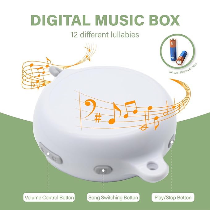 - 【12 Gentle Lullabies】The music box features a convenient on/off switch, an adjustable volume control button, and a button that allows easy switching between tracks. As the music plays, crib toys hanging gently rotate, help lull babies to sleep peacefully.