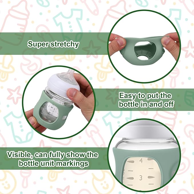 - Drop protection : Silicone bottle sleeves provides excellent protection for the bottle, bottom with reinforcement design, give that extra cushion in case the glass bottles fall, protect baby’s bottles from accidental drops breakage. It also anti-scalding if the glass is a little warm from heating up formula or milk