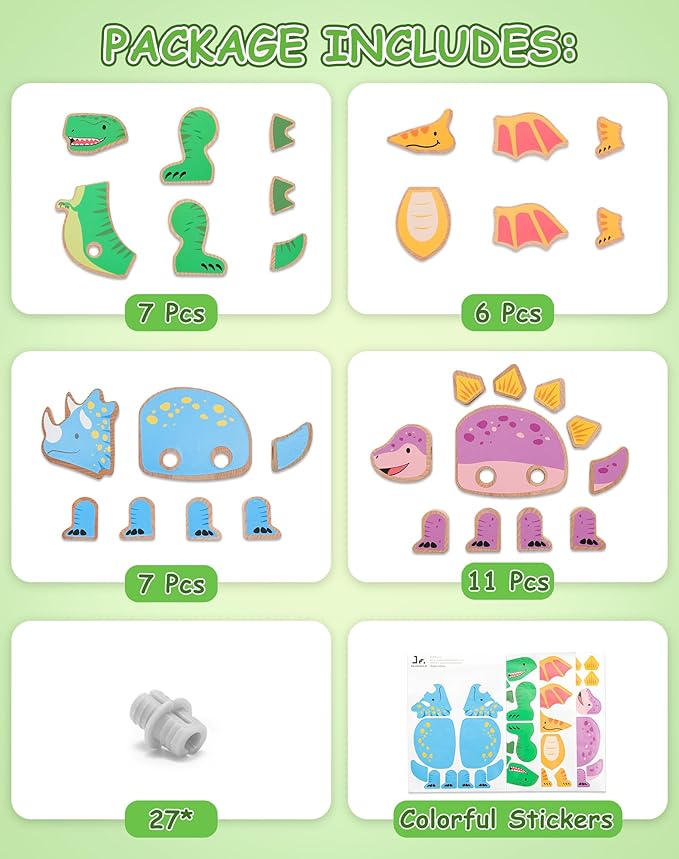 - Build & Decorate 4 Colorful Dinosaurs: The dinosaur wooden toys include 31 blocks, 27 connectors, and colorful stickers. Double the fun! Children delight in building their own dinosaurs and bringing them to life with colorful stickers