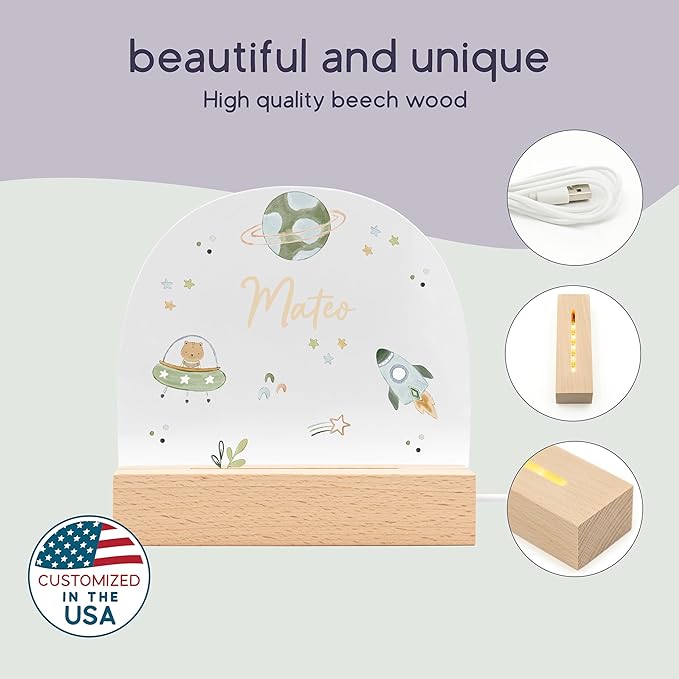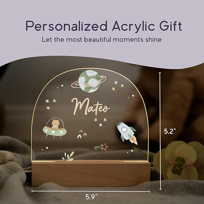 - Crafted from crystal-clear acrylic and a sturdy wooden base, this personalized night light offers a safe, non-toxic design, perfect for any nursery or child's room.