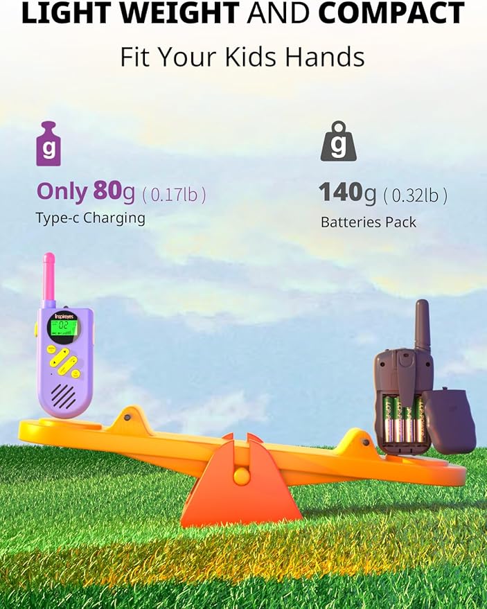 - Type-C Rechargeable, Long-lasting. Rechargeable walkie talkies features with upgraded built-in lithium polymer battery, no need to pay for aaa batteries anymore, long play time, up to 48 hours working time, 7 days standby.