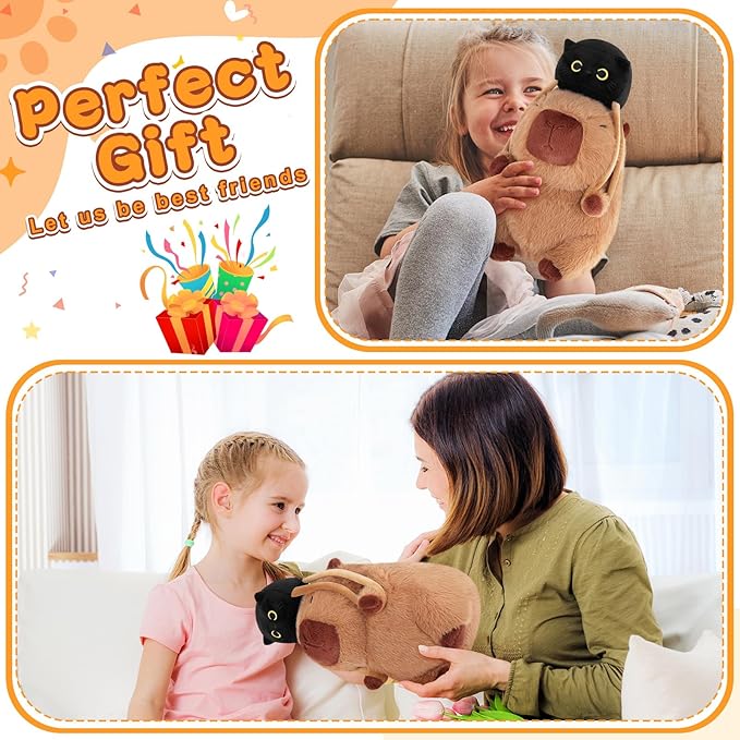 - 【Cute Capybara Stuffed Animals Design】This is a great design. A cute capybara carrying a black cat backpack that can be easily removed. Our plush doll are made by imitating real animals. You can put it anywhere you like. This is a perfect decoration and companion. We believe that if you bring these capybara gifts home, it will catch the attention of all your family or friends.