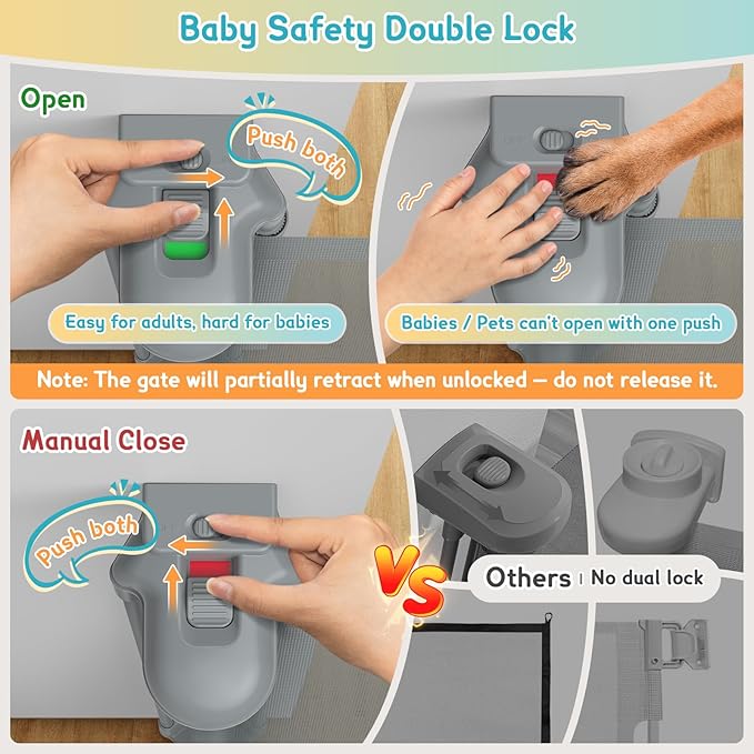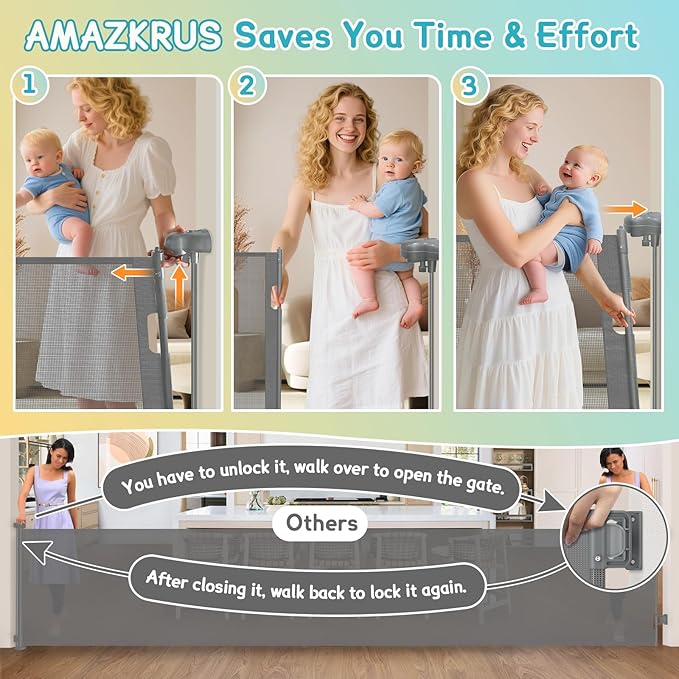 - [ Single-Side One-Hand Operation & Dual Safety Lock — Convenient & Secure ] Unlike other gates that require unlocking on one side and opening from the other, AMAZKRUS retractable baby gates lets you unlock, open, enter, close, and lock—all with one hand from the same side. No need to walk back and forth, saving time and effort. Our child-safe dual lock needs two fingers pushing switches simultaneously in different directions to unlock and lock. It’s easy for adults but hard for kids and pets, ensuring maximum safety without sacrificing convenience. This innovative design offers the perfect balance of ease and security for busy parents and pet owners.