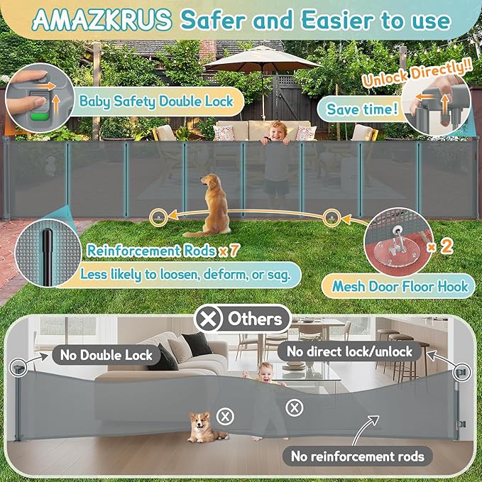 - [ Upgraded Reinforcement System – Stronger, Safer, More Durable ] Unlike flimsy gates that sag, lift at the bottom, or tear over time, AMAZKRUS retractable dog gate features upgraded fiberglass reinforcement rods with smooth, rounded ends to reduce mesh damage risks. Fully wrapped in thick Oxford fabric, double-layer PVC mesh, and double stitching, it resists scratches, punctures, and wear while enhancing stability. This design reduces top sagging, bottom lifting, and gaps that babies or pets could crawl through. Optional floor adhesive hooks provide extra bottom support. Durable indoors or outdoors, rain or shine.