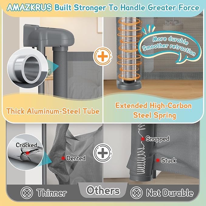 - [Stylish & Multi-Scene Safety Solution – Baby, Toddler, Pet Friendly] The AMAZKRUS indoor/outdoor retractable gate offers a sleek alternative to bulky metal or wooden barriers, blending into modern or classic interiors without ruining your décor. Perfect for stairs, wide doorways, hallways, patios, decks, garages, and more, it creates safe zones for babies, toddlers, and pets. retractable pet gate space-saving when retracted, it’s ideal for indoor and outdoor use, preventing dangerous falls, blocking access to restricted areas, and setting up secure play spaces—all while keeping your home open and stylish.