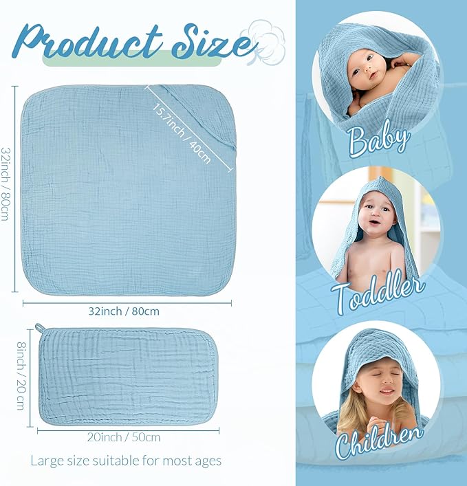 - Absorbent Infants Bath Towels: the baby bath towels and washcloths in this set boast 6 layers of muslin cotton; The quality muslin baby towels are adept at absorbing moisture from your baby's body quickly, ensuring they are dry and cozy after their bath; This ultra absorbency feature distinguishes these infant towels from the competition, making it the smart and efficient choice for baby care