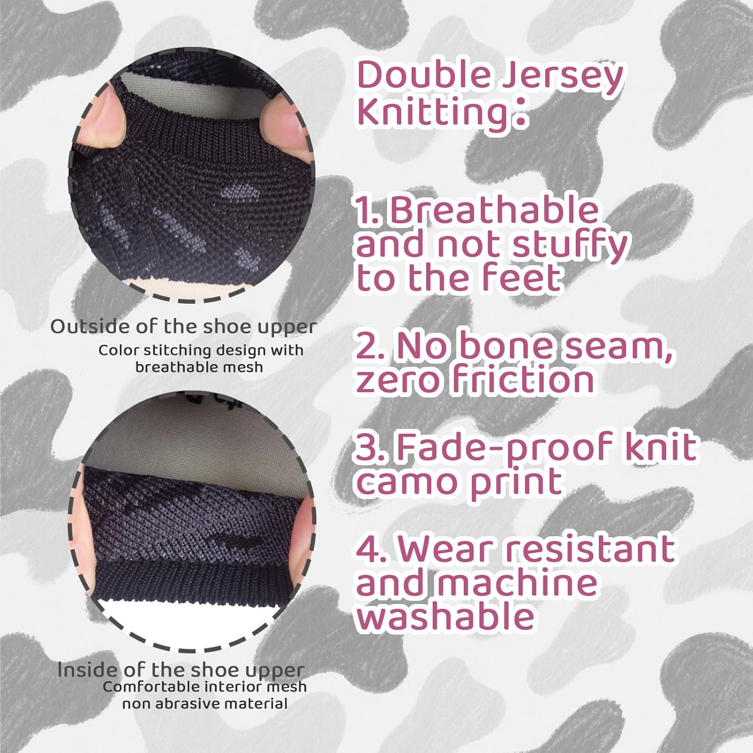 • Bold Style, Seamless Comfort:Double-sided knit design: rugged camo exterior for confidence, smooth interior for irritation-free wear. No bulky seams or pressure points. Let kids flaunt their personality while enjoying sock-like softness all day long.