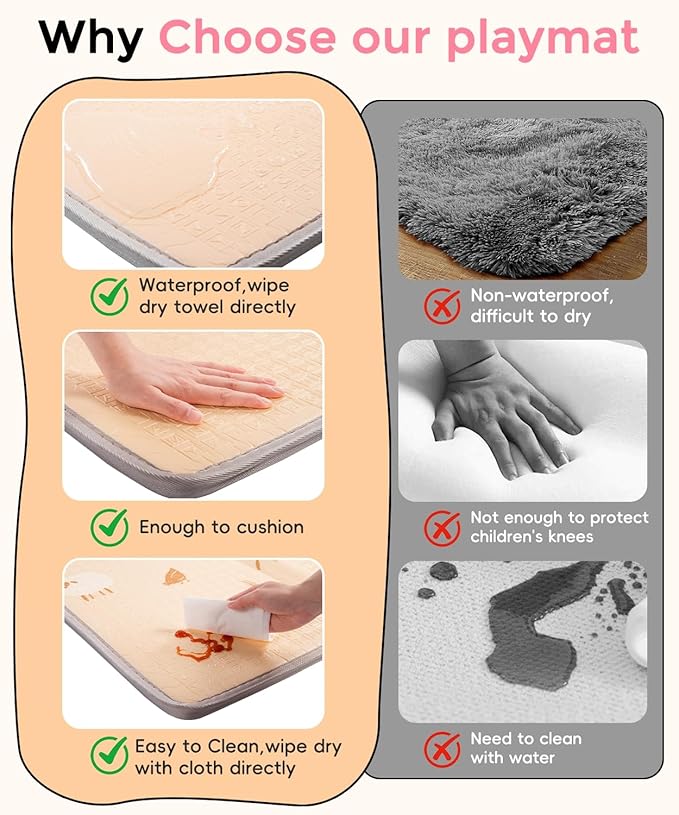 - 【Waterproof & Stain-resistant】Our playroom mat is with 100% waterproof surface,if your baby drools, spills milk or jam while playing, wipe it clean with a cloth directly