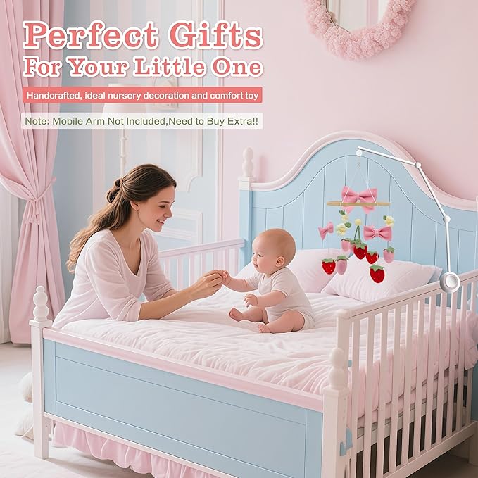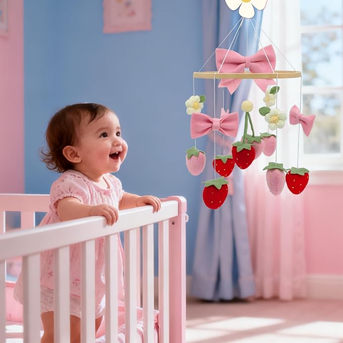 - šPink Bow and Strawberry Decor for Girls' Rooms: This crib mobile features pink bows, pink and red strawberries, daisies, and felt balls, all crafted from soft felt and natural wood. These charming designs will become the focal point of any nursery, adding delightful color to baby girl crib decor and creating a joyful, cozy atmosphere. (Helpful hint: It also effectively distracts your baby during diaper changes!)