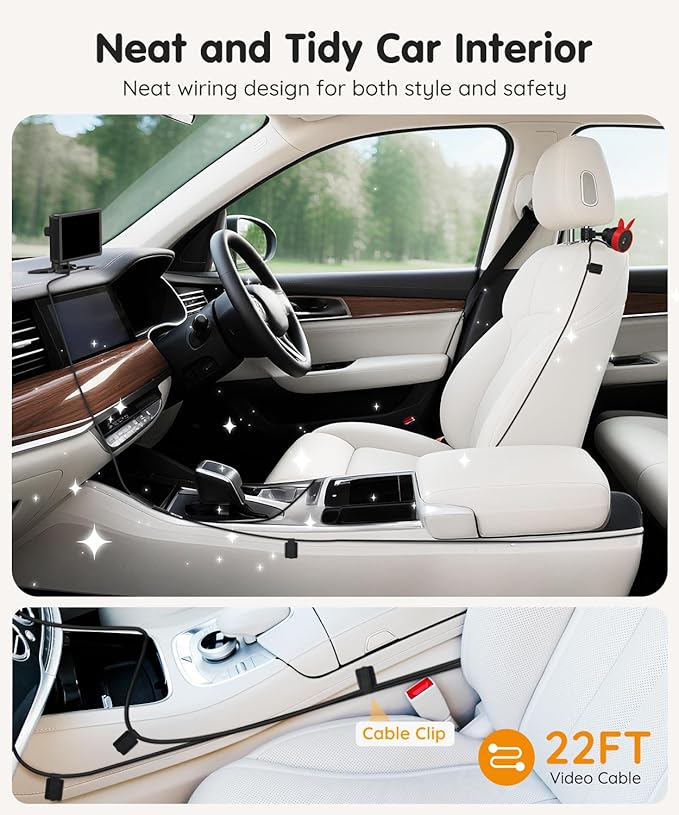 - Easy Installation: Set up this dual baby car camera in just 4 simple steps with a secure and stable mount. Included cable clips help organize cables neatly. The 22FT long cable makes this car baby monitor compatible with three-row vehicles, SUVs, and trucks, ensuring flexible and hassle-free installation.