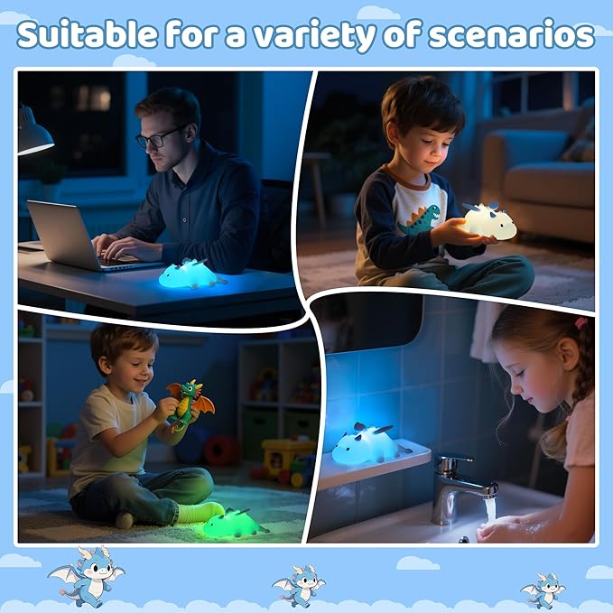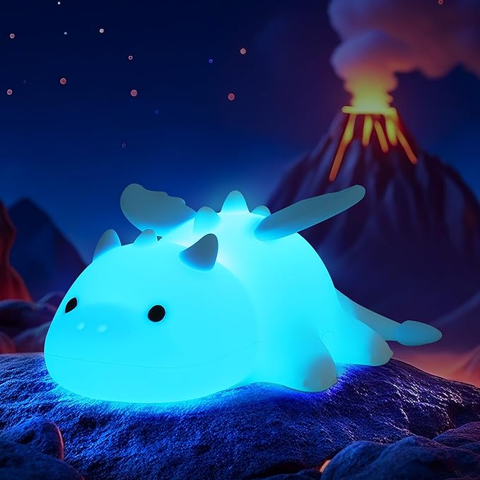 - Easy Use and Fun Touch Control: Toggle the switch to "RGB" to activate lighting. Gently press or squeeze the adorable dragon to cycle through 7 dynamic RGB hues. In this mode, the lights will automatically turn off after 30 minutes. When switched to warm light mode, tap repeatedly to adjust 3-level brightness, offering versatile illumination for various scenarios.