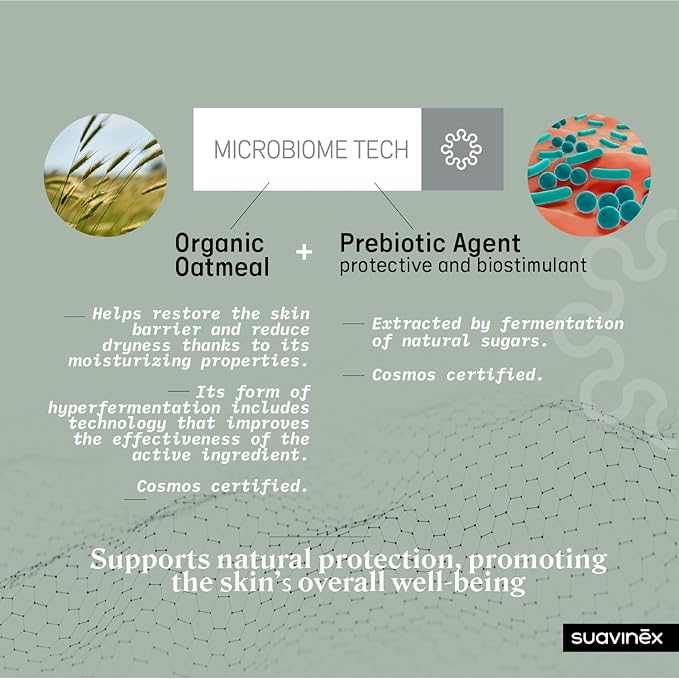 - Microbiome Tech - our exclusive formula inspired by the skin microbiome, is made with organic oatmeal and prebiotic agents support natural protection, promoting the skin's overall well-being.