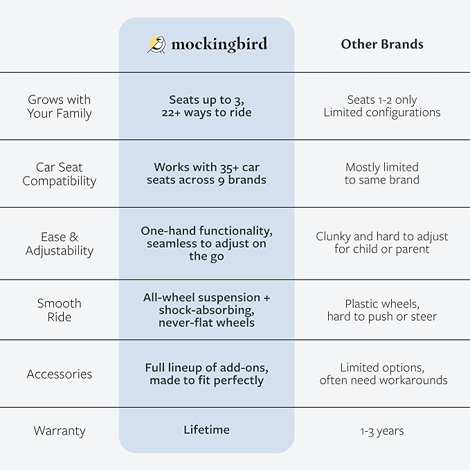 - WHAT’S INCLUDED: the Mockingbird Single-to-Double Stroller 2.0 comes with the stroller frame, 4 wheels, 1 seat with detachable child bar, extendable canopy, and a cup holder.