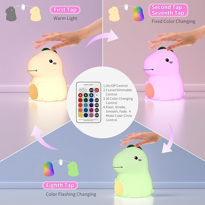 - [ Customizable Light Modes ] : This dino night light offers soft, flicker-free illumination that lasts through the night. Easily switch between 16 soothing colors and 3 brightness levels with a simple tap. The cozy ambient light creates a calm atmosphere that helps kids relax and fall in love with bedtime again.