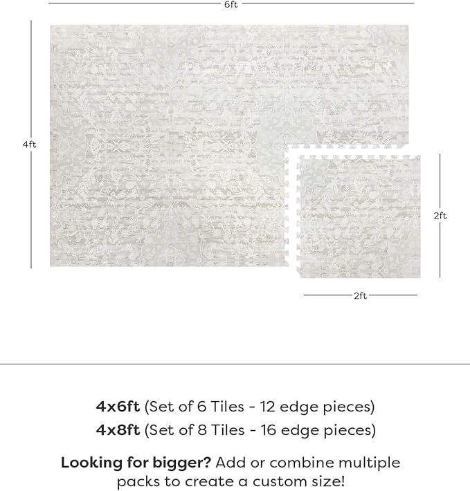 - INTERLOCKING FOAM TILES FOR EASY SETUP - Our play mats arrive in a set of 6 tiles. Designed with modular interlocking foam, our kids play mats connect easily like a puzzle perfect for quick assembly, rearrangement, or storage. Each 24.8” x 24.8” tile is 0.47" thick and comes with edge pieces to create a seamless, rug-like finish that looks great in any space. Perfect for growing play areas or multi-room use.