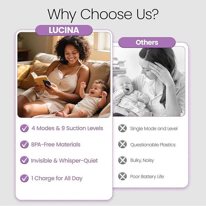 - Customizable Modes for Better Comfort- Lucina wearable breastfeeding pump hands free features 4 modes and 9 suction levels to let you personalize your electric breast pumping rhythm and strength. Whether you need gentle stimulation or stronger suction, find the setting that matches your milk flow and comfort needs