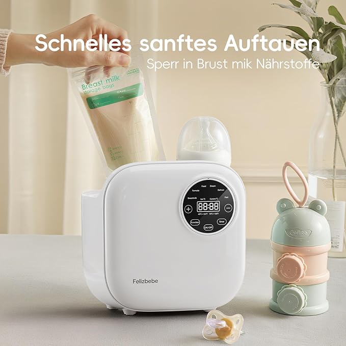- Easy to Use: Fast Warming /Precise Temperature Control/Defrost/Breastmilk Warming/Formula/Timer/Keep Warm/ Steaming / Food Heating/Water Bath Warming. Multi function, all in one with smart one tap.High aesthetic fashion forward breast milk warmer—a practical choice for modern moms.