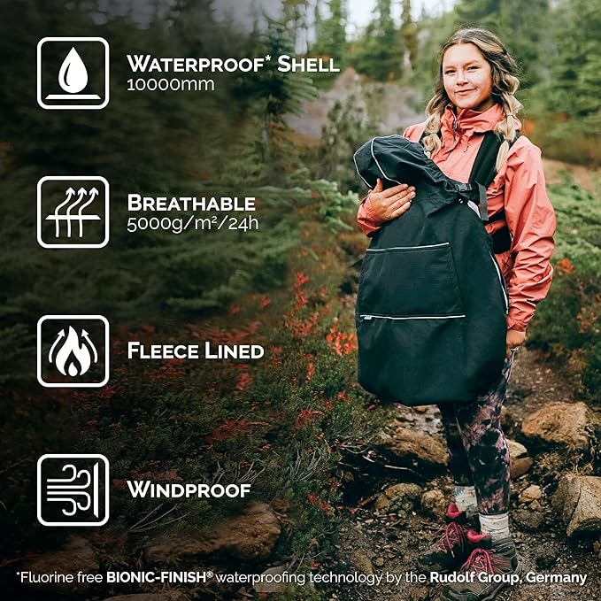 - WATERPROOF: The rain cover shell is fully waterproof. *Featuring a fluorine and PVC free DWR coated fabric with Bionic-finish technology from Germany and a fully waterproof inner membrane. *Wind-proof, soil-repellent, breathable. *Fabric Waterproof Rating: 10000 mm. *Fabric Active Breathability: 3000g/m2/24h.