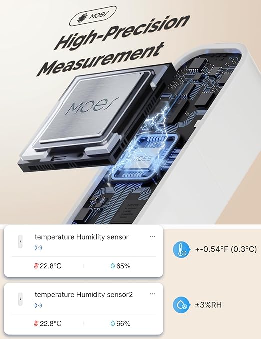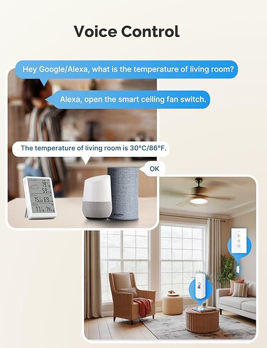 - 【Real Time Smart Control】Via voice commands and remote app access, this room hygrometer thermometer sensor monitors temperature and humidity in real time. When the kit detects a change, you'll receive a alarm notification via app and email. It seamlessly connects to other smart devices through a unified smart ecosystem, allowing you to create personalized smart scenes tailored to your lifestyle needs.