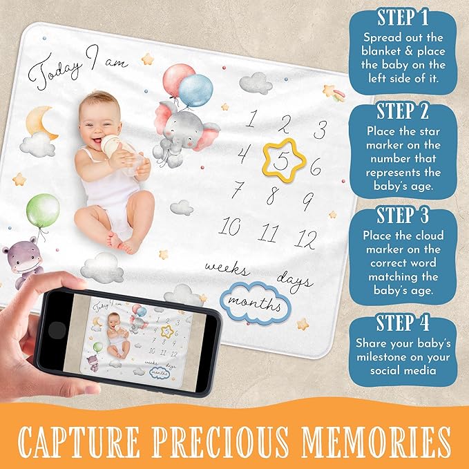 - [Milestone Markers Included]: This blanket includes two adorable milestone markers a yellow star and a blue cloud. Mark your baby's growth milestones with ease. Simply place these cute markers on the blanket to indicate the age or special event, and snap the perfect photo to cherish forever.