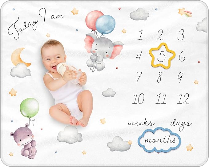 - [Custom Designed Milestone Blanket]: Capture precious memories with this beautifully designed baby milestone blanket. Featuring playful baby animals, clouds, stars, and soft pastel neutral shades on a white background. Perfect for monthly milestone photos, making each moment special for you and your baby.
