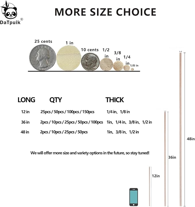 - 1. Size: bamboo dowel rods long 24inch, diameter 1/4 inch. Package Includes: 50Pcs bamboo dowel rods.