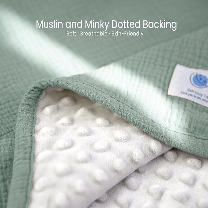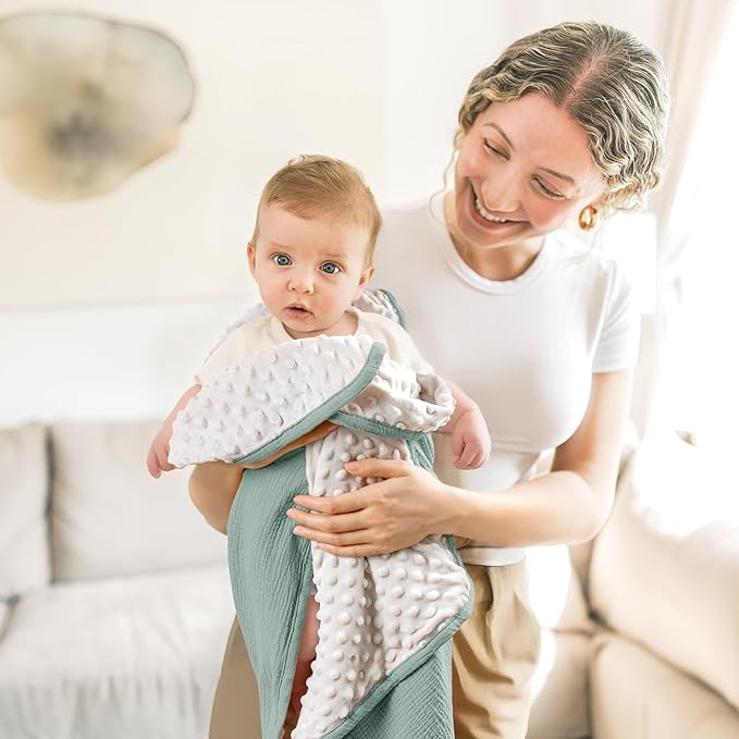- Lightweight Dual-Fabric Design: Muslin & Minky Dot - Features a breathable muslin front and a warm minky fleece back. The lightweight, double-layer construction balances airflow and thermal retention, ideal for naps or daily cuddling.