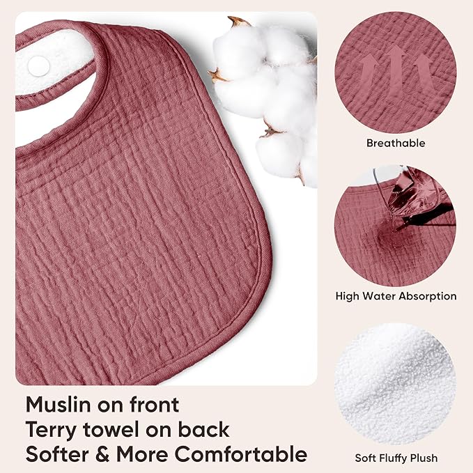 - Soft & Superior Absorbency: Our Susurration Muslin Baby Drool Bibs are crafted from 100% cotton muslin on the front, they are backed with water-resistant soft plush to ensure maximum absorption with a skin-friendly, gentle touch for your baby's skin. The dual-layered design ensures both you and your baby remain free from wet clothes all day long.