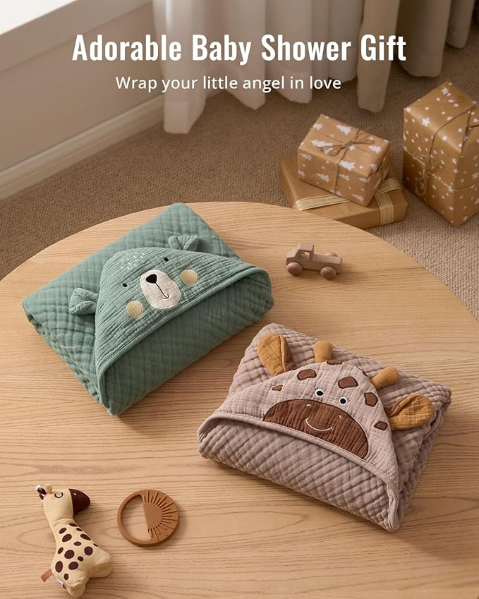 - Lovely Gift: Snuggle your baby in our bear or giraffe hooded towels. The fun designs make bath time enjoyable for both babies and parents. A thoughtful unisex baby essential and baby shower gift that will wrap your angel in love