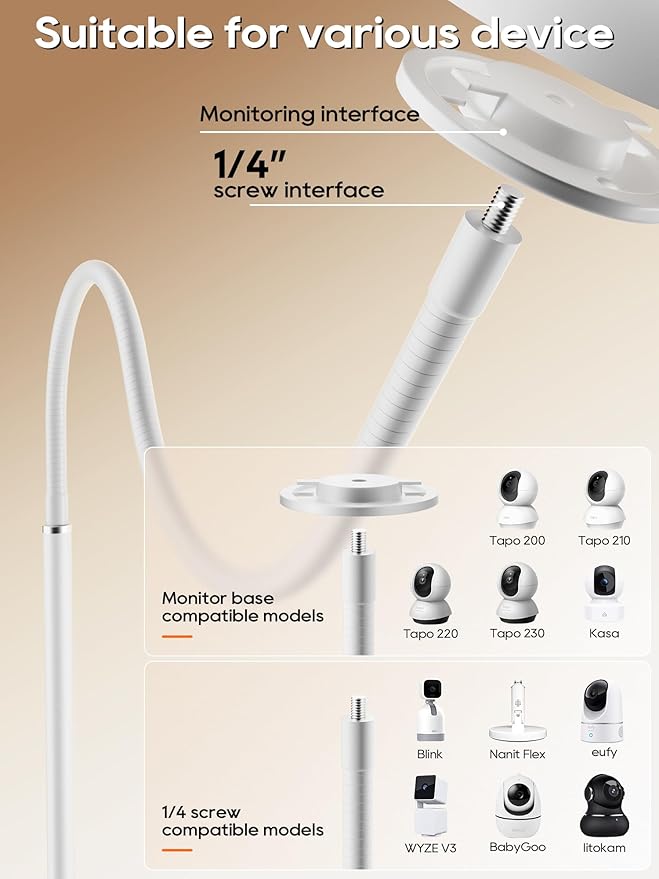 - 【Universal Compatibility】: SAPESEHE floor stand baby monitor holder is designed to work seamlessly with the Nanit Pro Smart Baby Monitor & Flex Stand/Tapo C200/Tapo C210/HelloBaby HB65TX HB66 pro/Kasa EC70/WYZE Pan v3/eufyE220/Blink Mini Pan-Tilt Camera, and any monitor or baby monitor cameras with a 1/4-inch threaded hole (tripod mount). Please confirm your camera model before purchase. (NOTE:All Baby monitors are not included) If you're unsure, feel free to inquire about compatibility with your device.
