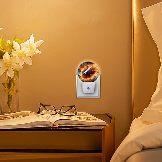 Round LED Night Lights Lamp with Dusk to Dawn Sensor, American Football Ball on Fire Night Light Plug Into Wall for Kids Room, Bedroom, Bathroom, Kitchen, Hallway